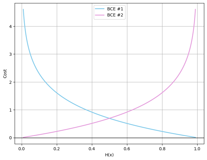 BCE #1은 실젯값($Y_{i} = 1$)이 1일 때의 수식, BCE #2는 실젯값($Y_{i} = 0$)이 0일 때의 수식이다.