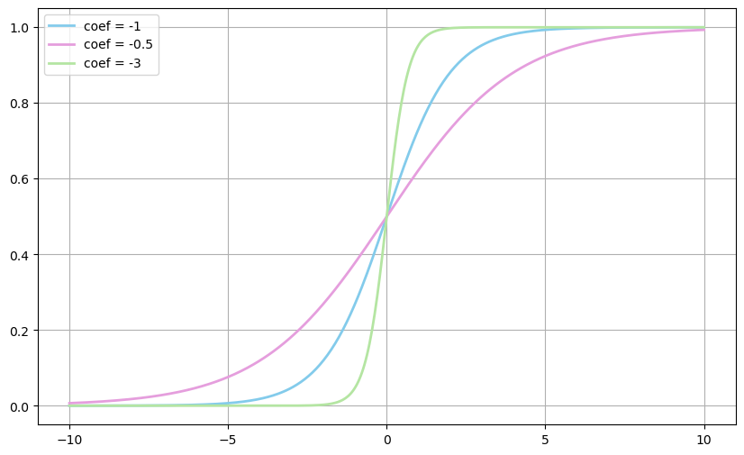 다음 그림은 계수에 따른 시그모이드 함수의 변화를 보여준다.