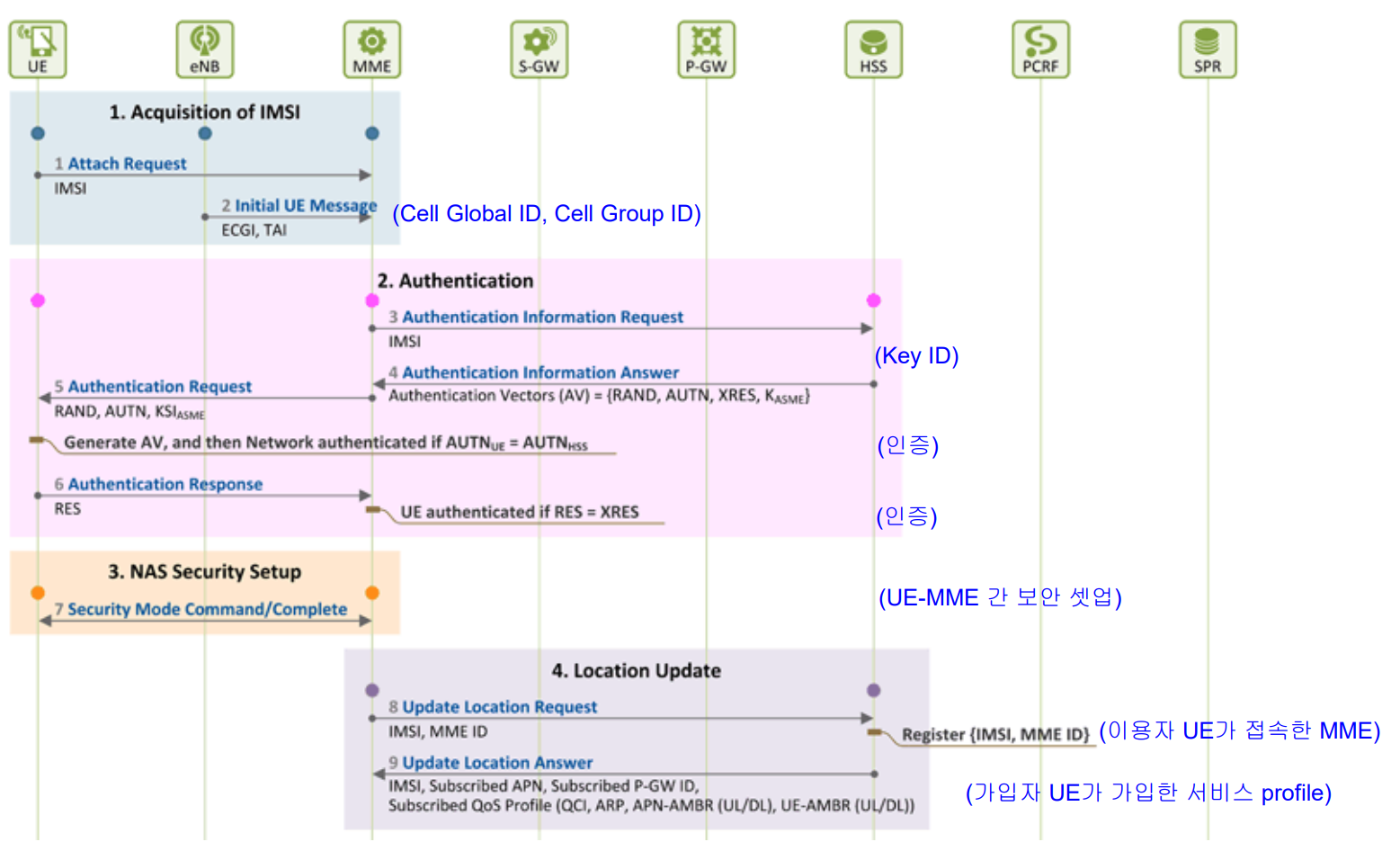 - HSS는 이를 승인하면서 IMSI와 가입자 정보를 MME에게 보냄.