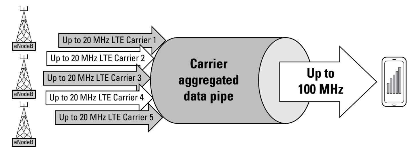 Carrier Aggregation을 통해 파편화된 주파수 대역폭을 하나로 묶고 넓히면 데이터의 전송 속도를 획기적으로 높일 수 있음. 초기엔 5개의 CC(component carrier)를 묶어 100MHz의 대역폭을 지원했으며, 3GPP release 13 때부터 최대 32개의 CC를 묶을 수 있게 됨.