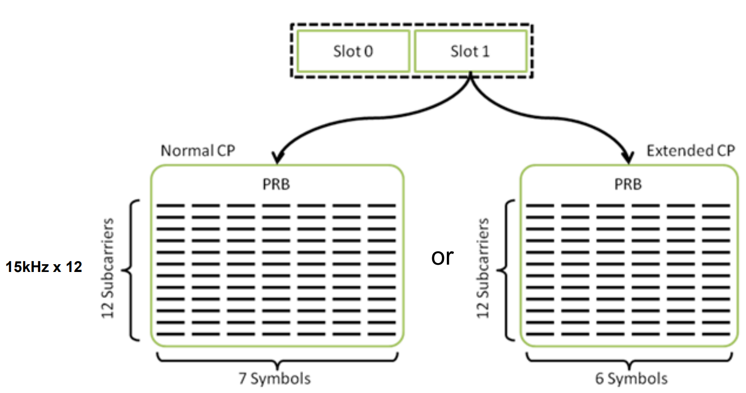 무선 자원은 PRB(Physical Resource Block) 단위로 할당되며, 서브캐리어는 세로로 12개 들어감. Normal CP는 심볼이 가로에 7개, Extended CP는 심볼이 가로에 6개 들어감.