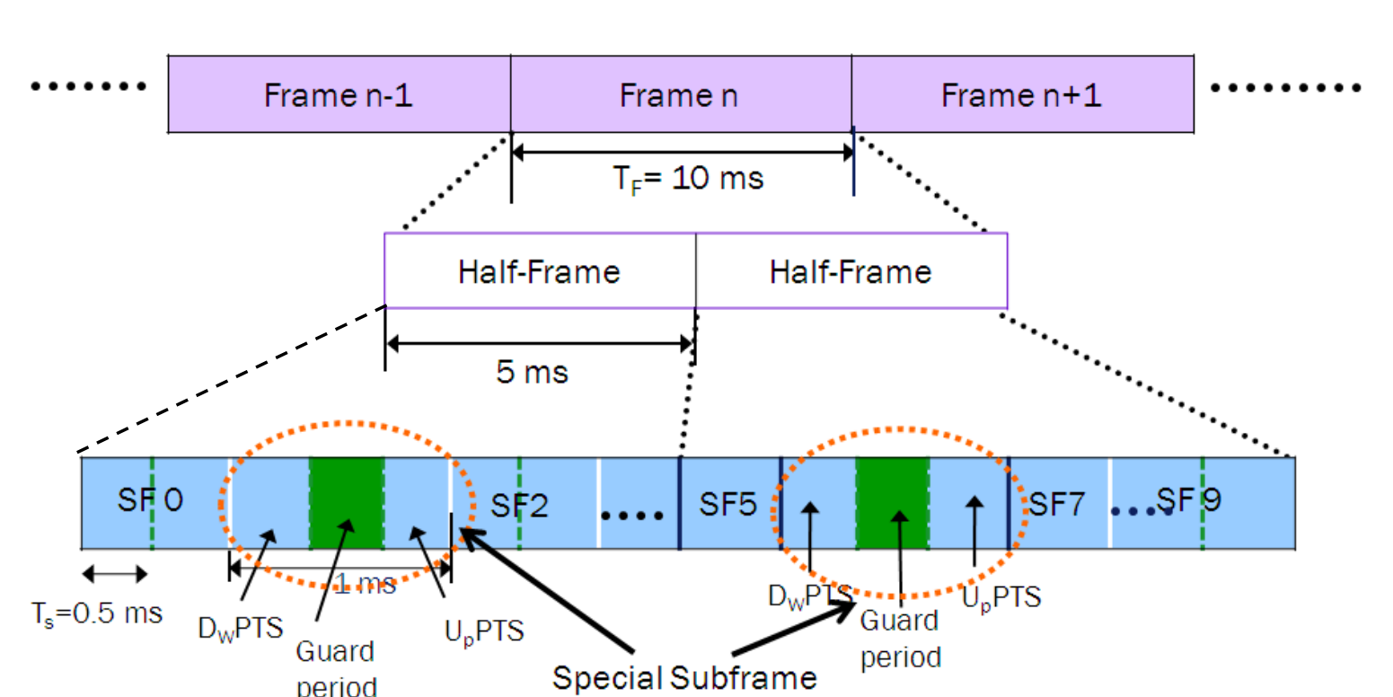 LTE TDD 프레임은 10ms(프레임) -> 5ms(하프 프레임) -> 1ms(서브프레임) 순으로 쪼개지며, 서브프레임은 DL로 쓰이거나 UL로 쓰임. 이때, 서브프레임의 종류가 바뀌는 순간 신호가 섞이지 않도록 완충지대인 스페셜 서브프레임을 사용하며, 서브프레임은 DL 신호 전송의 꼬리인 DwPTS, 신호를 보내지 않고 비워두는 Guard period, 데이터 전송 전 기지국에게 채널 상태를 알리는 UpPTS로 구성됨. 주기성에 따라 스페셜 서브프레임의 개수가 달라짐. (5ms 주기면 한 프레임 안에 2개, 10ms 주기면 한 프레임 안에 1개)