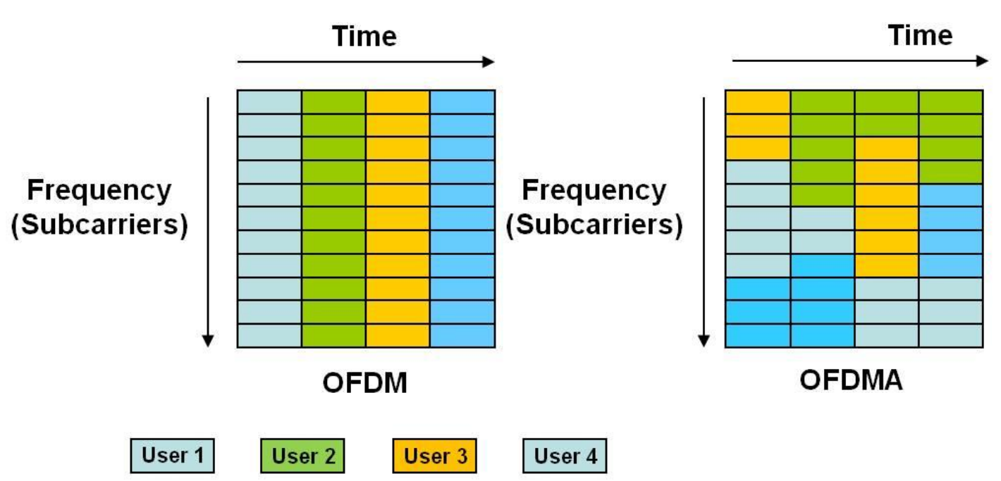 특정 시간 동안 모든 주파수를 사용자 한 명이 사용하던 OFDM과 달리 OFDMA는 같은 시간 동안 주파수 조각을 여러 사용자가 나누어서 사용함 -> 자원의 낭비를 방지하고 지연 시간을 단축함.
