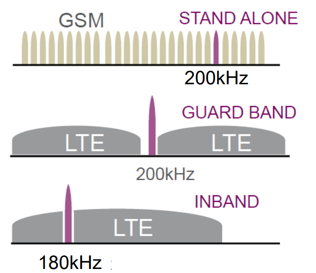 NB-IoT는 정확히 180kHz의 대역폭을 사용하는데, 이는 1PRB의 폭과 정확히 일치해 LTE망의 PRB 하나를 NB-IoT로 사용할 수 있음. 이때의 운용 방식은 LTE 대역과 상관 없이 독립적인 주파수를 사용하는 stand alone, LTE 주파수 대역의 가장자리 여유 공간을 활용하는 guard band, LTE 대역의 PRB 하나를 골라 사용하는 inband 3가지가 있음.